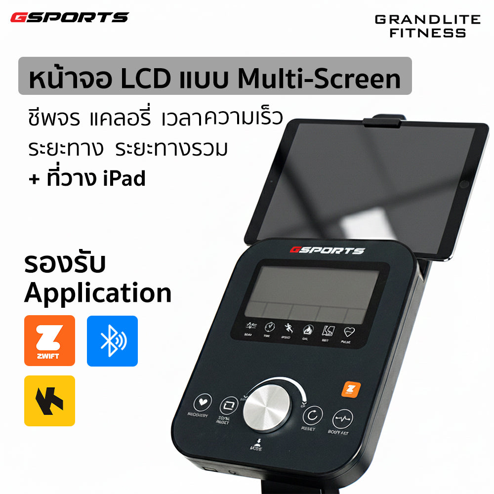 - หน้าจอ LCD แสดงความเร็ว, แคลอรี่, เวลา, ระยะทาง, ระยะทางรวม, ชีพจร + ที่วาง iPad (มีที่วางแก้วน้ำ)